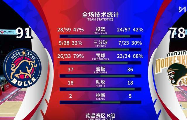 当然,比赛的进程可谓一波三折。南京同曦守住了开局,守住了第一节,单节26-20,领先6分。即便在第二节,香港金牛队疯狂追分,单节打成23-21,追回2分。不过,半场结束的时候,南京同曦还是领先的。